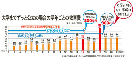 公立か私立か、どんな習い事をさせるかなどで金額は違ってきますが、一般的に最も教育費が増えるのは入学金などがかかる高校進学時と、大学受験の準備などで出費がかさむ高校3年から大学の間です。