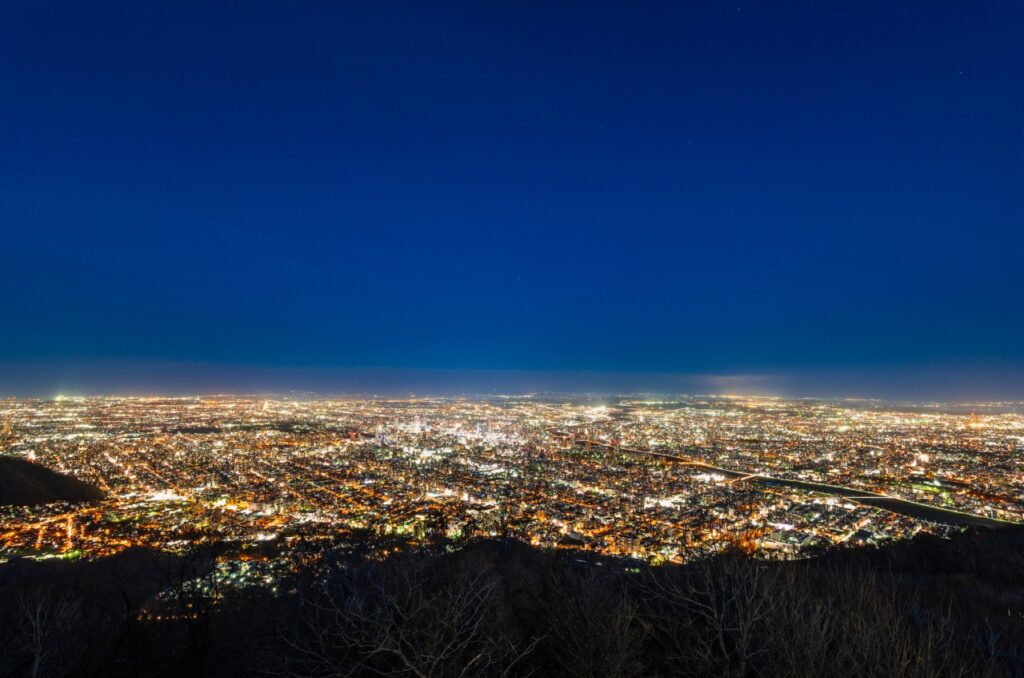 山頂から見下ろす札幌の街は、まるで星空を逆さまに広げたよう。碁盤の目状に整った市街地が光に包まれ、札幌ドームや大通公園のきらめきも一望できます。